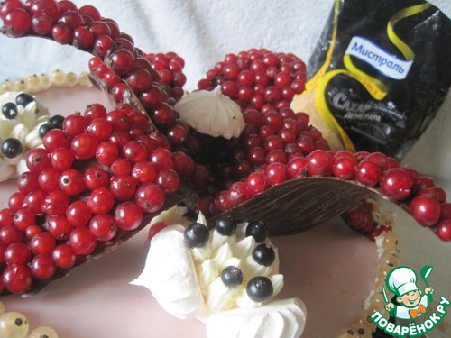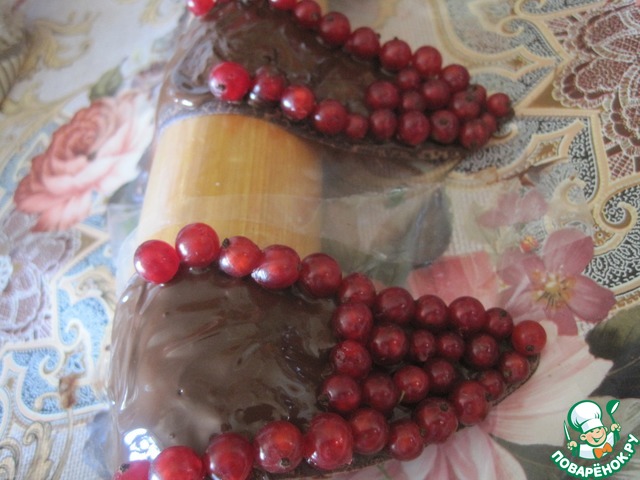 Кладем на скалку. Пока шоколад не застыл, приклеиваем красную смородину. После застывания шоколада файл снимаем.
