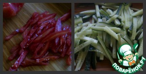 Говядину нарезаем соломкой. Складываем в чашу, заливаем 1/3 частью соуса и даем замариноваться в течении 30-60 минут.