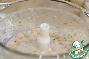 Соус я поделила на две части- в первую дома добавила мелко нарезанную кинзу, а во вторую-уже на даче мелко нарезанную мелиссу. от кусочков травки я избавляться не стала, но что бы получить однородную массу, можно еще раз протереть через сито.