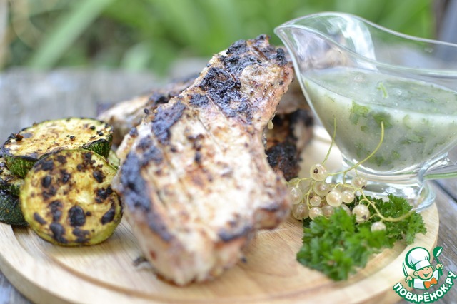 С двумя соусами. Свинина на ребрышках, вымоченная в маринаде из смородины, приготовленная на гриле-вкусный дачный обед!