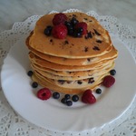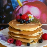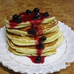 Подавать со свежей клубникой и черникой, листиком мяты, медом или кленовым сиропом. Также можно добавить взбитые сливки.