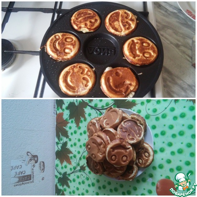 Намочить кухонное х\б полотенце, положить на стол рядом с плитой. Если столешница не из камня, тогда подложите под него разделочную доску. Раскалить сковороду, поставить ее на пару секунд на мокрое полотенце, вернуть на огонь, вылить половину половника теста (или меньше), уменьшить огонь, чтобы панкейк не пригорел. Процедуру повторять перед каждым панкейком, при необходимости полотенце намочить еще раз.