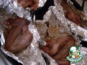 Каждое крылышко завернуть в фольгу и запечь до полуготовности.