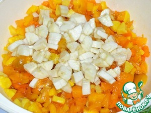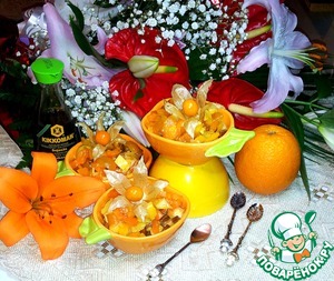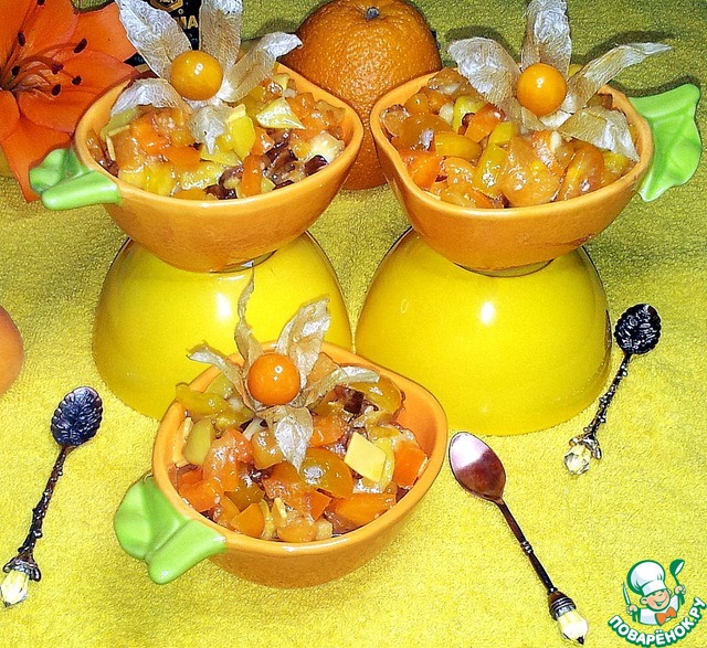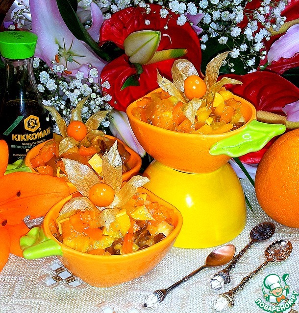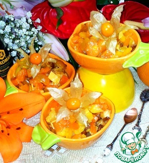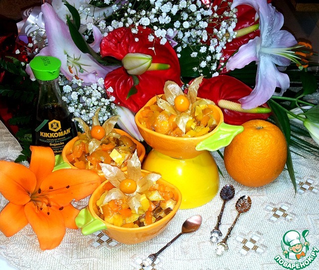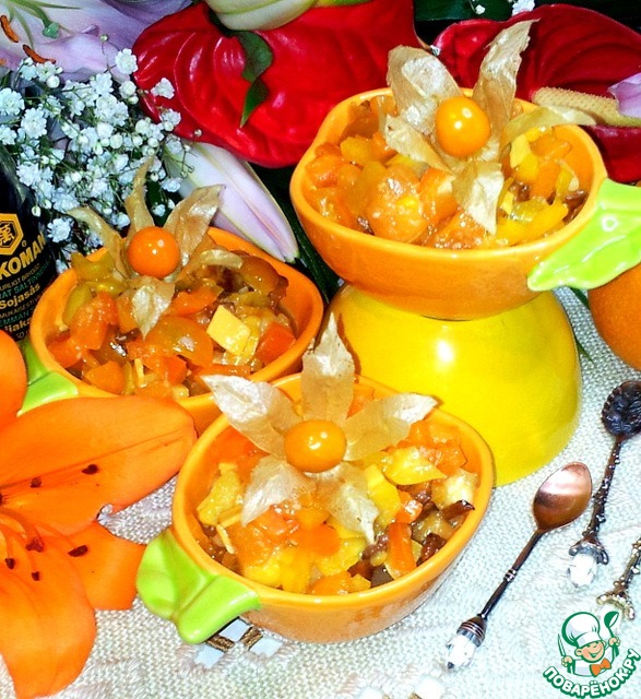 Пикантный рыжий салат из овощей и фруктов с добавлением ароматного, душистого перца и корицы.