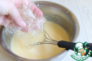 Желатин зальем водой. У меня был в пластинках. Желтки слегка взбиваем с сахаром. Молоко разогреем и льем тонкой струйкой в желтки. Ставим назад на огонь и на медленном огне варим до загустения.