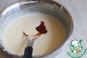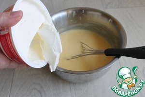 Теперь дадим немного остыть и кладем маскарпоне. Сразу размешиваем венчиком.