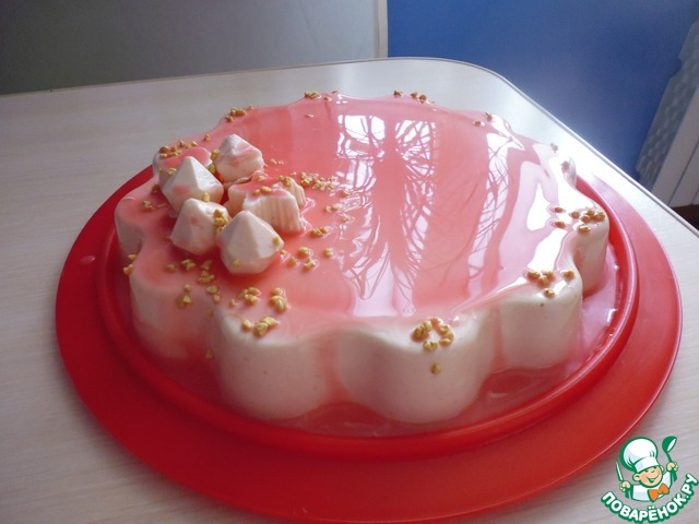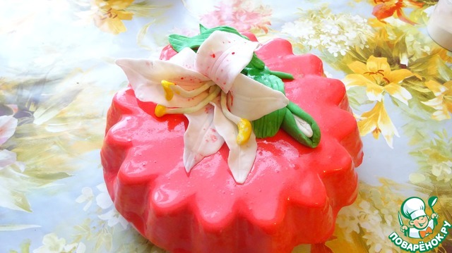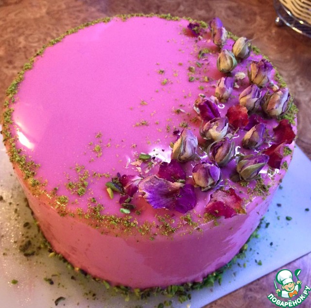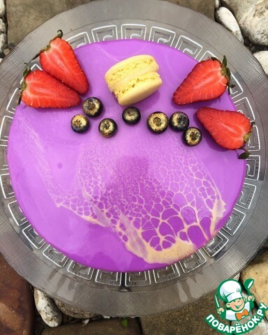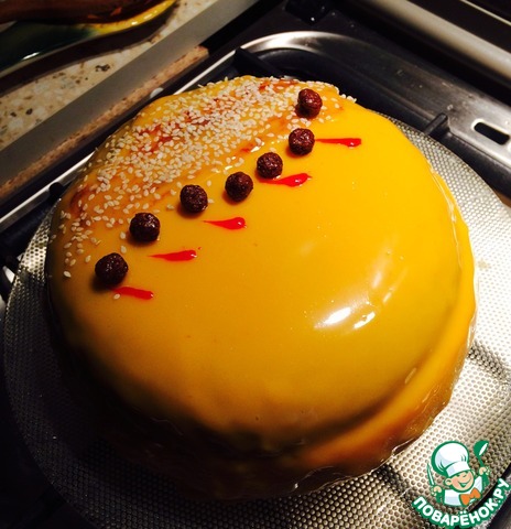 К сожалению, далее процесс я не фотографировала, потому что боялась, что ничего не получится. Итак, достаем торт, удаляем форму, благо, что она снимается прекрасно. Переворачиваем его, чтобы бисквит был снизу у нас. Ставим его на решетку или лучше на блюдце, а блюдце на перевернутую пиалу. Так легче снимать такой торт. И теперь поливаем глазурью. Тут тоже надо наловчиться. Сначала льем по бокам, затем быстрым движением переходим к центру и льем по центру. Но это мое личное наблюдение. Снимаем наш торт при помощи спатулы или просто рукой берем за низ и лопаткой я убрала капли. И сразу кладем на блюдо и подставку. Верх украшаем по своему.