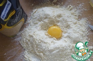Весь сахар превратить в сахарную пудру, я воспользовалась кофемолкой. Начать приготовление теста. Для этого муку насыпать горкой, добавить 80 г сахарной пудры, холодное сливочное масло порубленное кусочками. Перетереть в крошку с помощью рук. Сделать углубление и добавить желток.