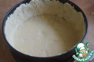 Тесто раскатать и выложить в разъемную форму, сформировать бортики. Поверх выложить бумагу для выпечки с горохом или фасолью, чтобы тесто не вздулось. Выпекать 10-15 минут. Снять бумагу с горохом и запечь еще 5 минут.