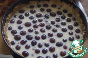 В готовый корж выложить крыжовник и залить заливкой. Поставить в духовку на 30-40 минут. Начинка должна начать густеть.