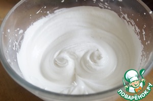 Пока печется пирог нужно приготовить безе. Для этого яичные белки нужно взбить миксером с сахарной пудрой до устойчивых пик.