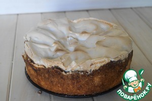 Пирог достать из духовки, выложить приготовленное безе, сделать красивые волны и поставить в духовку еще на 7-10 минут. Безе должно красиво подрумяниться. Резать на порции только в остывшем виде. Приятного чаепития!