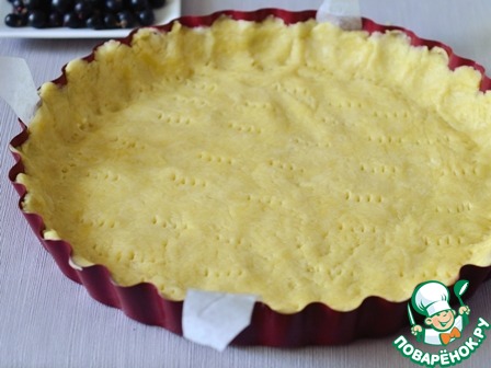 Охлажденное тесто руками равномерно распределяем по форме, формируя бортики. Для этого пирога высота бортиков не имеет существенного значения, так как безе держит форму и не течет, лишь немного увеличивается в объеме при выпечке. (Можно обойтись и без бортиков, если вам не очень важен окончательный вид пирога.) Накалываем тесто вилкой.