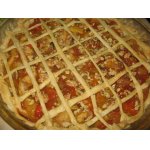 Застилаем тесто сверху бумагой для выпечки и насыпаем небольшой слой гороха (или т. п.) в качестве груза. Он не даст тесту подняться. Ставим основу пирога с грузом в горячую духовку (180 град.) и выпекаем примерно 15 минут. Затем убираем бумагу с горохом и допекаем корж до готовности - легкого золотистого цвета. (Еще примерно 5-10 минут). Опять же, если вам не столь принципиален внешний вид и разрез пирога, то основу можно выпечь и без груза. Можно чуть-чуть уменьшить пропорции в тесте, если хотите корж потоньше. И еще... Если будете печь пирог в холодное время года, обратите внимание на то, чтобы горох (груз) был теплый, комнатной температуры, а не с холода. Иначе время выпечки дна заметно удлинится, а бортики за это время могут начать подгорать.
