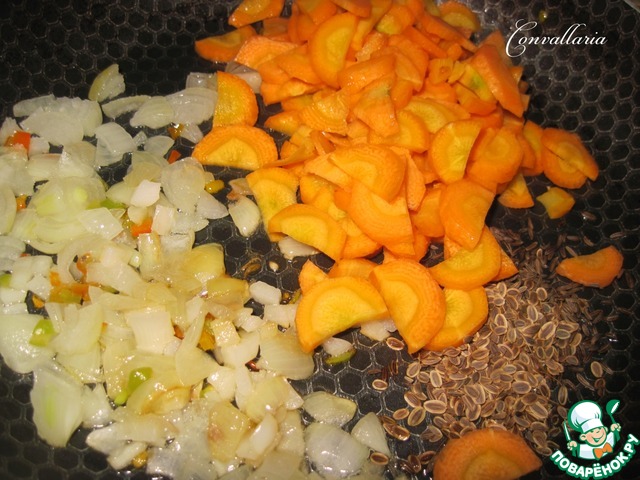 Морковь нарезать полукольцами, переложить в сковороду, всыпать семена укропа и тмина. Перемешать и обжаривать еще 1 минуту. -
