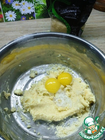 Желтки отделяем от белков, белки нам не потребуются, желтки добавляем к тесту. Соду гасим и добавляем к желткам. Замешиваем тесто, добавляем оставшиеся 20 гр муки. Муки может потребоваться больше, или меньше, в зависимости от вашей муки.
