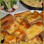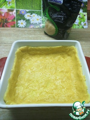 Тесто распределяем по форме, у меня 20х20, формируем бортики. Многократно накалываем вилкой. Запекаем в духовке 15-20 мин при Т 200С.