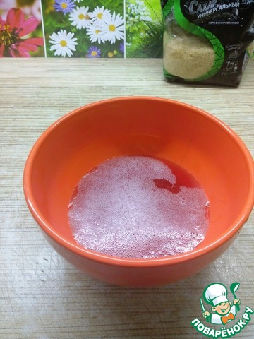 Пока корж печется приготовим желе. Разводим согласно инструкции на упаковке, но в ПОЛОВИНЕ нормы воды. То есть у меня написано развести в 200 гр воды, я развожу в 100 гр.