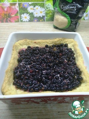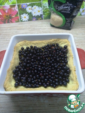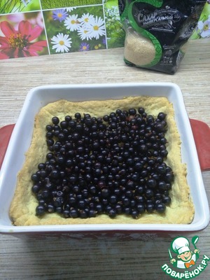 Собираем пирог. На корж выкладываем смородину, посыпаем оставшимися 2-мя ложками сахара.