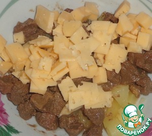 Твердый сыр порезать кубиками и добавить в общую миску.