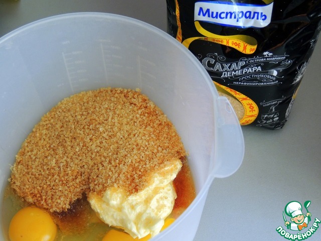 В миске соединяем яйца, размягчённое масло и коричневый сахар от Мистраль.