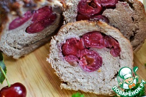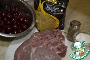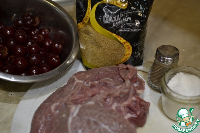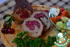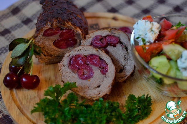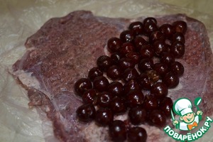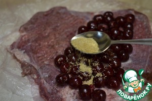Распределяем сахар по вишне, скатываем мясо в плотный рулет и закрепляем ниткой (у меня обычная, сложенная в несколько раз)