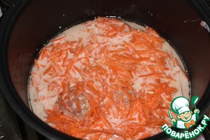 Теперь готовим заливку для тефтелей. В ёмкость наливаем молоко и добавляем тертую морковь, майонез, крахмал, соль. Все хорошо перемешиваем.