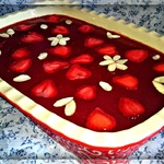 Аккуратно вылить, половину клубничной охлажденной смеси на сливочный слой. Выложите нарезанные (заранее) ягоды и залейте остальной половиной клубничного желе.