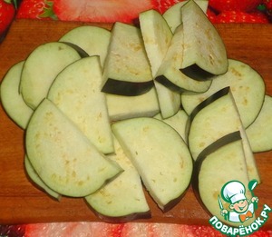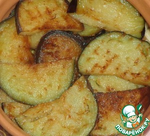 Баклажан порезать полу кружочками и обжарить на растительном масле.