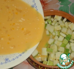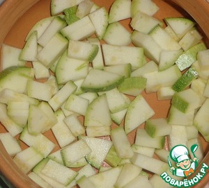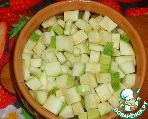 Кабачок порезать кубиками. В форму выкладываем половину нормы кабачка.