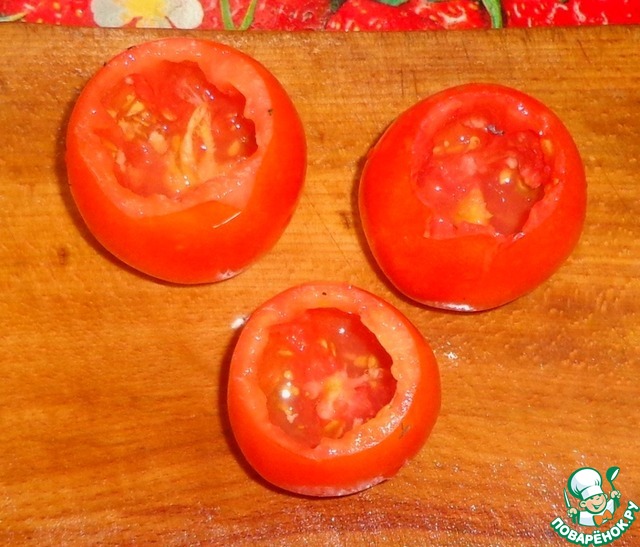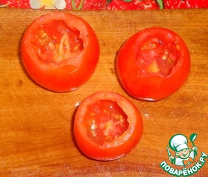 Помидоры промыть. Срезать верхнюю часть и выбрать мякоть с семенами.