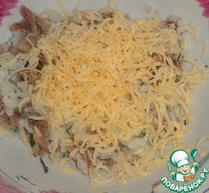 Сыр натереть на мелкой терке. Половину сыра добавить в начинку.