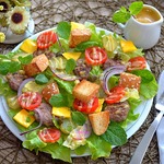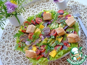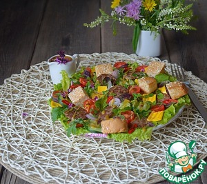 Неизменными составляющими салата, для меня, остаются салат Айсберг, салат листовой, гренки, мини-котлеты из говяжьего фарша, лук красный, огурчик (зимой маринованные корнишоны, летом-малосольный или свежий)