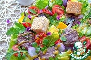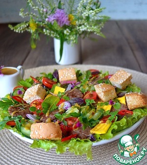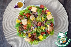 В тарелку укладываем салатные листья (рвем руками или режем), зелень, мини-котлетки, овощи, квадратики сыра, поливаем заправкой, сверху- гренки.