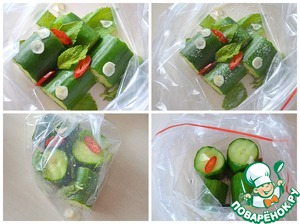 Для салата нам потребуется малосольный огурец (по вашему любимому рецепту), если под рукой его не оказалось, то можно взять пакет положить туда листики мяты, зубчик чеснока, 1/2 чайной ложки соли, пакет закрутить, встряхнуть содержимое, огурец убрать в холодильник на ночь.