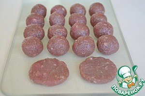 Приготовим из говяжьего фарша фрикадельки, затем придавим их так, чтобы получились плоские, тонкие лепешки по 5 см в диаметре,