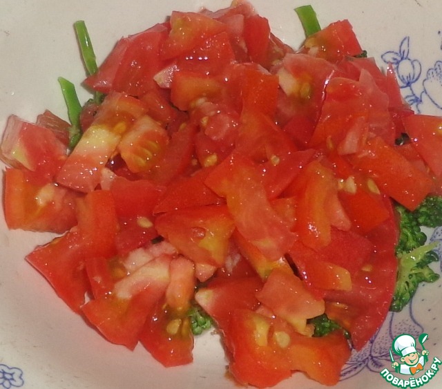Помидор нарезать кубиками и соединить с брокколи.