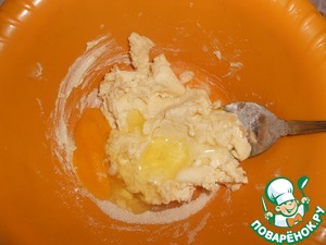 К масляно-сахарно-яичной смеси добавить мучную и замесить тесто.