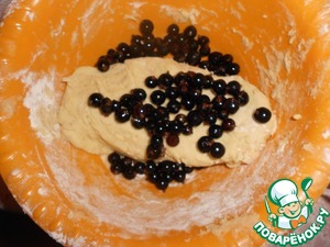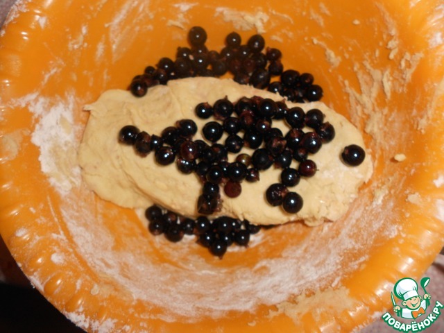 Добавить ягоды черной смородины и аккуратно подмешать их в тесто.