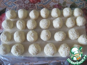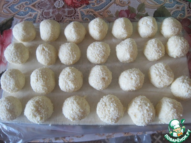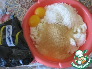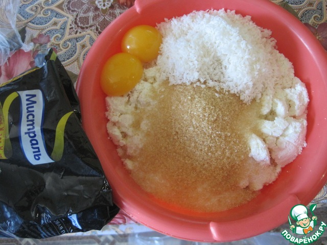 Готовим творожные шарики: творог смешиваем с сахаром (у меня ТМ Мистраль), желтками, мукой и кокосовой стружкой