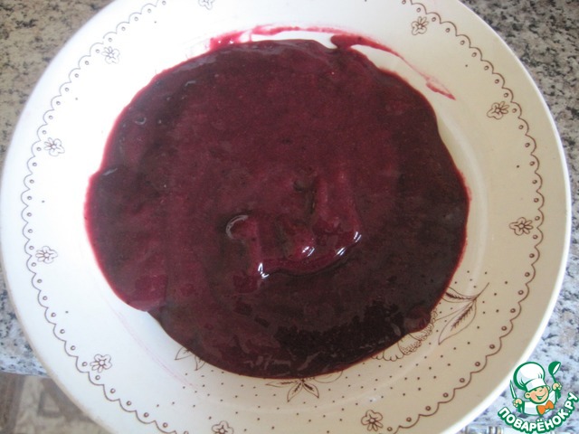 Смородину берем слегка перезревшую, она более яркая и ароматная. Измельчаем блендером, протираем через мелкое сито, получается пюреобразный сок