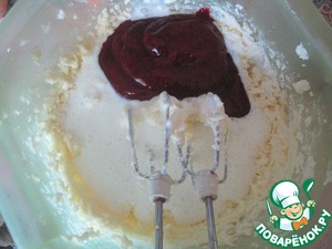 Добавляем муку и тесто (консистенция немного гуще сметаны) делим на 2 части