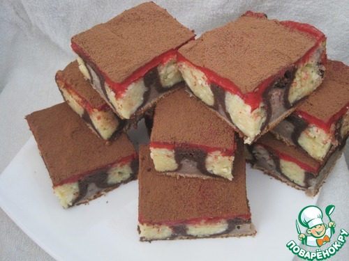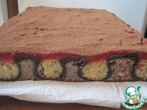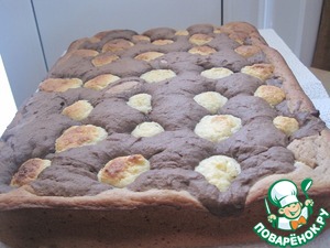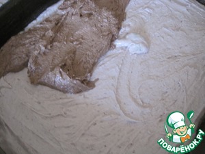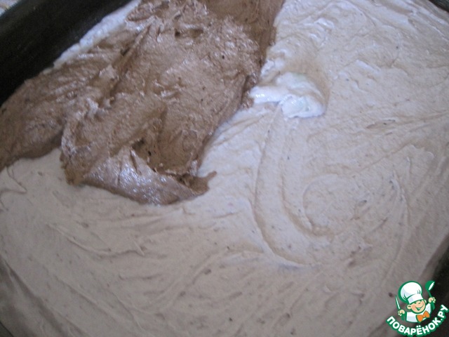 На противень выкладываем 1 слой-тесто без какао, 2-ой с какао-порошком