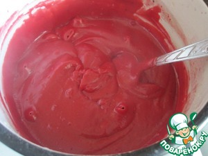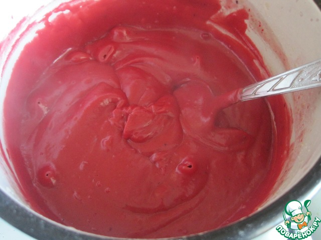 Готовим Заварной крем: Яйцо взбиваем с сахаром, добавляем муку, молоко и свежевыжатый сок смородины и варим при постоянном помешивании несколько минут
