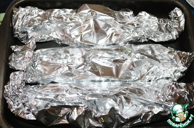 Каждый кусочек заворачиваем в фольгу. И отправляем в разогретую духовку до 200 градусов на 40 минут.