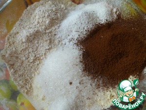Добавляем сахар, ванильный сахар, измельченные овсяные хлопья, просеянные какао и крахмал.