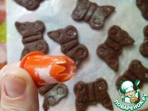 Туловище и глазки бабочек я сделала с помощью зубочистки, а вот кружочки на крылышках с помощью насадки для крема.
