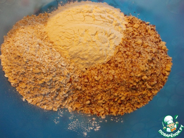 Смешать муку, фундук и хлопья.
