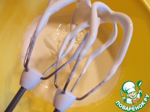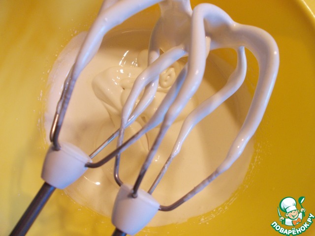 Белки взбить с сахаром ТМ Мистраль. На поверхности должны оставаться следы от венчика.