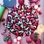 Украсить еще мягкую шоколадную пиццу, вдавливая слегка руками в шоколад, клубникой, черной смородиной и орехами, посыпав сверху мелким сахаром и крупными кристаллами. Ягоды все же у нас кислые, а шоколад горький - для полной гармонии как раз и не хватает карамельной сладости тростникового сахара ТМ "Мистраль"! Снова поставить в холодильник до полного застывания шоколада. У меня стояла около часа.